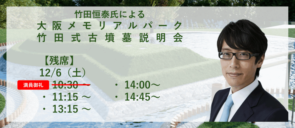 大阪メモリアルパークに完成した「竹田式前方後円墳」について、株式会社前方後円墳 代表取締役 竹田恒泰 氏 による説明会を開催いたします。